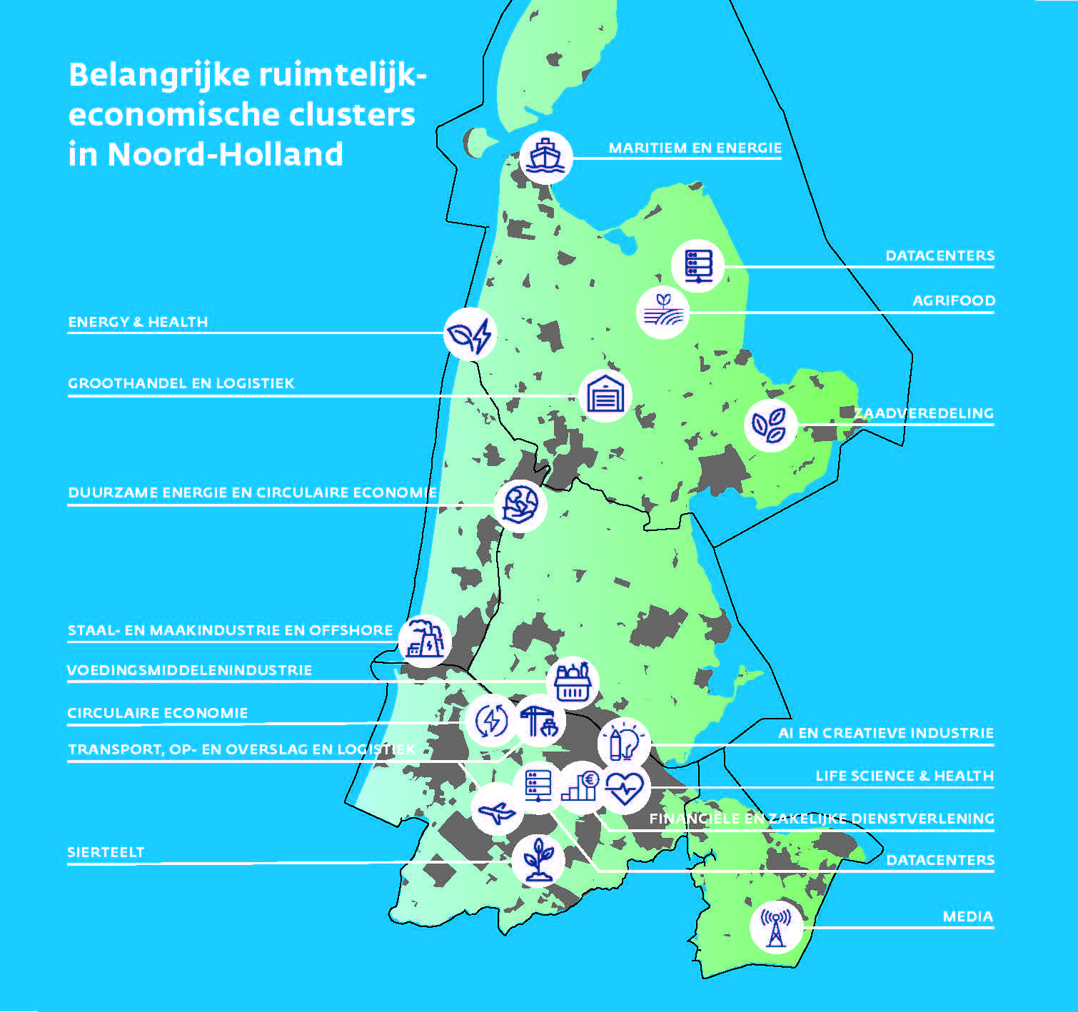 De provincie is economisch sterk en veelzijdig, met sectoren die variëren van de industriële transitie in de IJmond en het Noordzeekanaalgebied tot de groei van Life Sciences & Health en de internationale betekenis van Seed Valley. Tegelijk staat Noord-Holland voor stevige uitdagingen in een dichtbevolkte en dynamische regio die blijft groeien richting 2050.