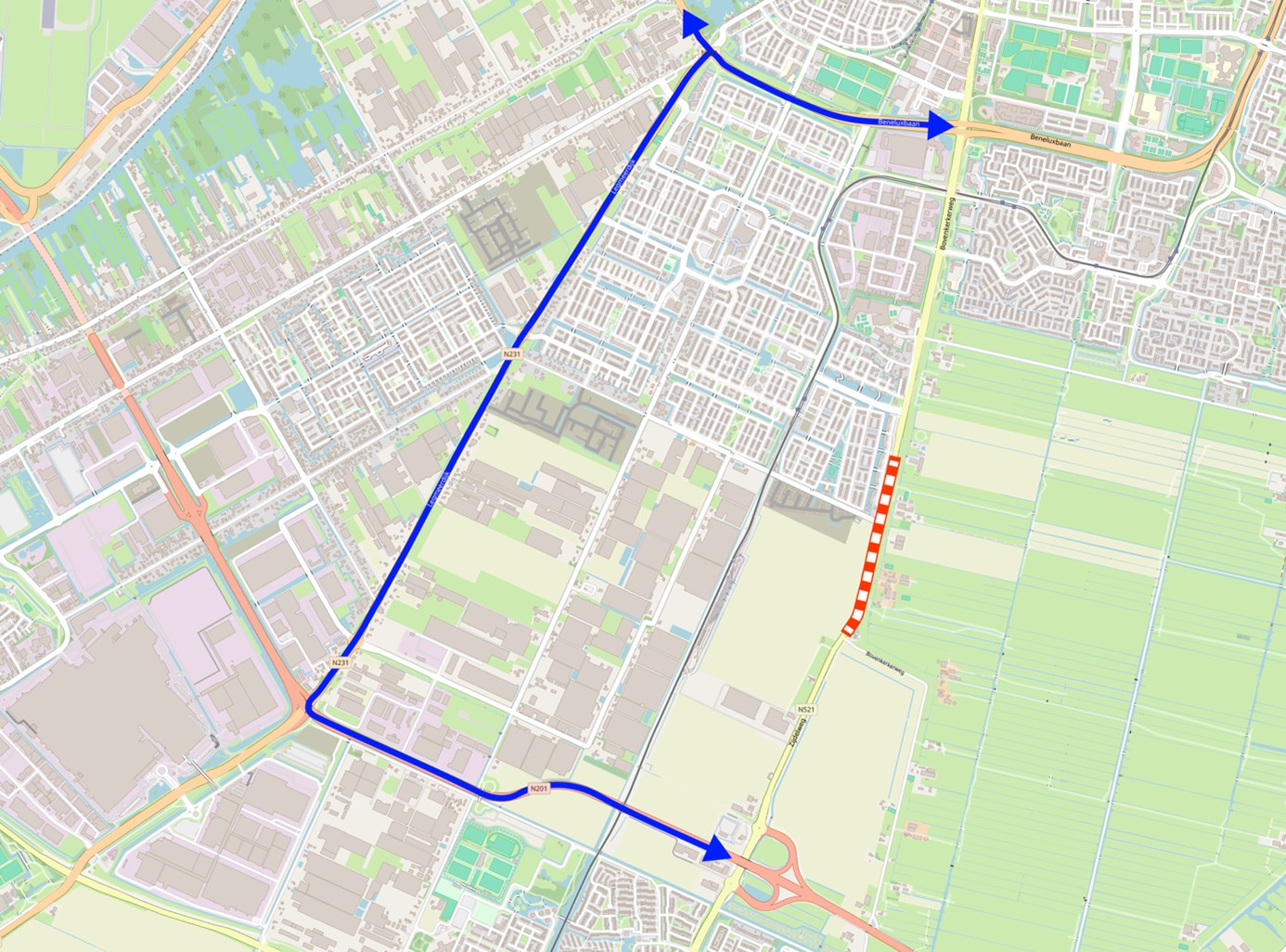 Om de werkzaamheden veilig uit te kunnen voeren, is het weggedeelte de Bovenkerkerweg (N521) vanaf de kruising met de Zijdelweg tot Bovenkerkweg 96 afgesloten (rood-witte stippellijn op onderstaande kaart). Deze werkzaamheden zorgen voor hinder en extra reistijd met de auto. Het doorgaande verkeer en buslijn 174 worden omgeleid via de N201, N231 en Beneluxbaan (blauwe doorgetrokken lijn op onderstaande kaart. Voor de bus komen tijdens de werkzaamheden meerdere haltes in Amstelveen-Zuid te vervallen. Plan uw reis vooraf via www.connexxion.nl. (Brom)fietsers en voetgangers kunnen langs de werkzaamheden zonder omleiding.