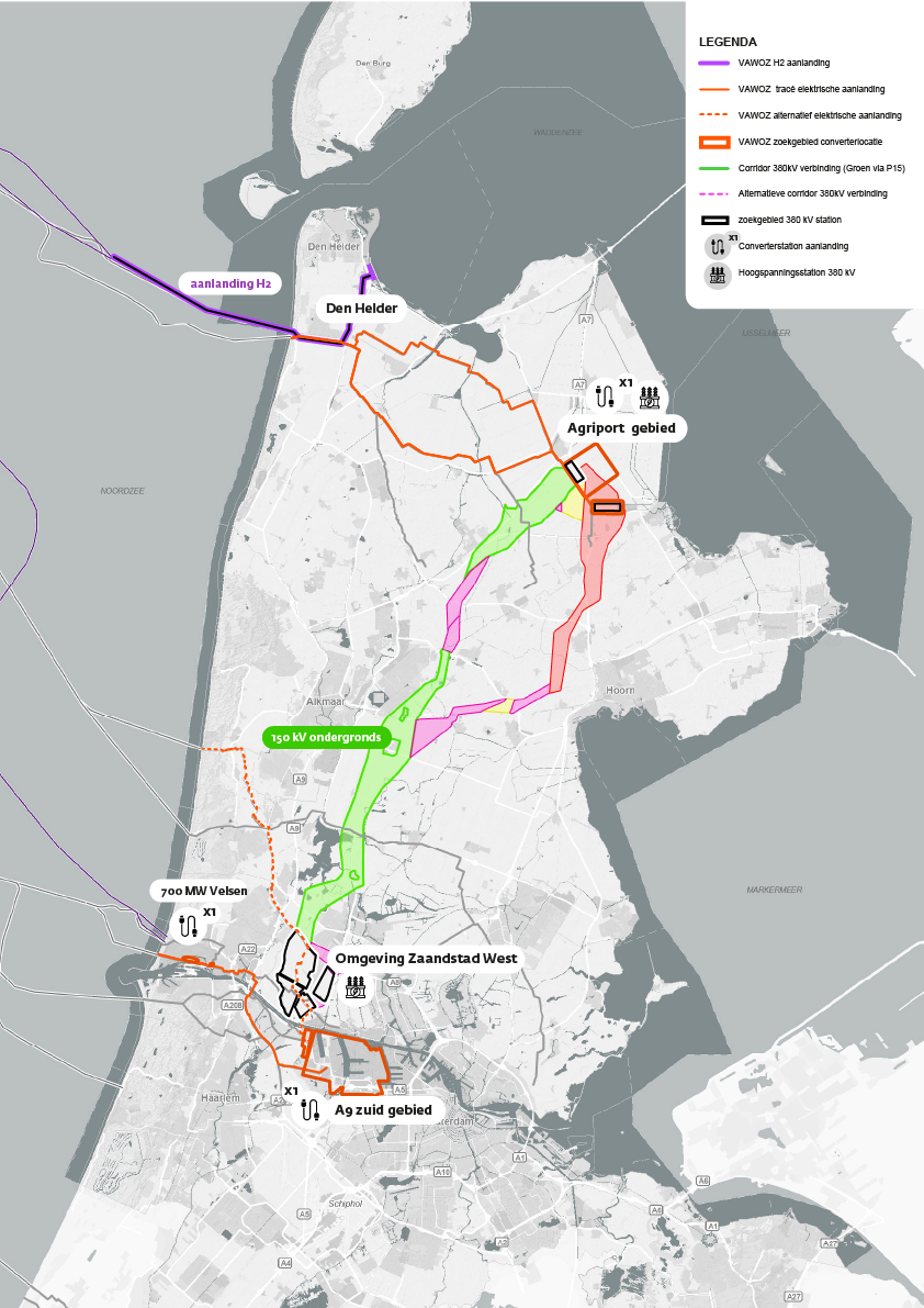 Met deze route wordt het zuidwestelijke deel van de provincie, waar de leefbaarheid al onder druk staat, verder belast. Ook worden enkele Beschermde Landschappen aangetast. Daarom stelt de provincie als voorwaarde om de bestaande 150kV-verbinding(en) ondergronds te brengen van Beverwijk tot De Weel. Voor de aanlanding van elektriciteit uit zee is gekozen voor een aanlanding van waterstof bij Den Helder en 2 elektrische aanlandingen van 2GW. 1 in de Kop van Noord-Holland en 1 ter hoogte van de A9-Zuid. Daarnaast kan een aanlanding van 700mW bij het huidige station Velsen komen.