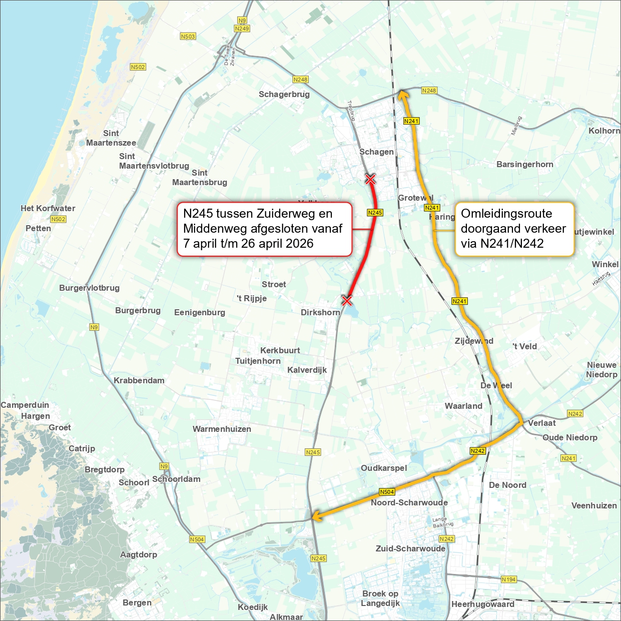 0 reactiesDe provincie Noord-Holland sluit van dinsdag 7 april 6.00 uur tot en met zondag 26 april 2026 18.00 uur de N245 ten zuiden van Schagen af voor doorgaand verkeer. Het gaat om het deel tussen de kruisingen met de Middenweg en de Zuiderweg.