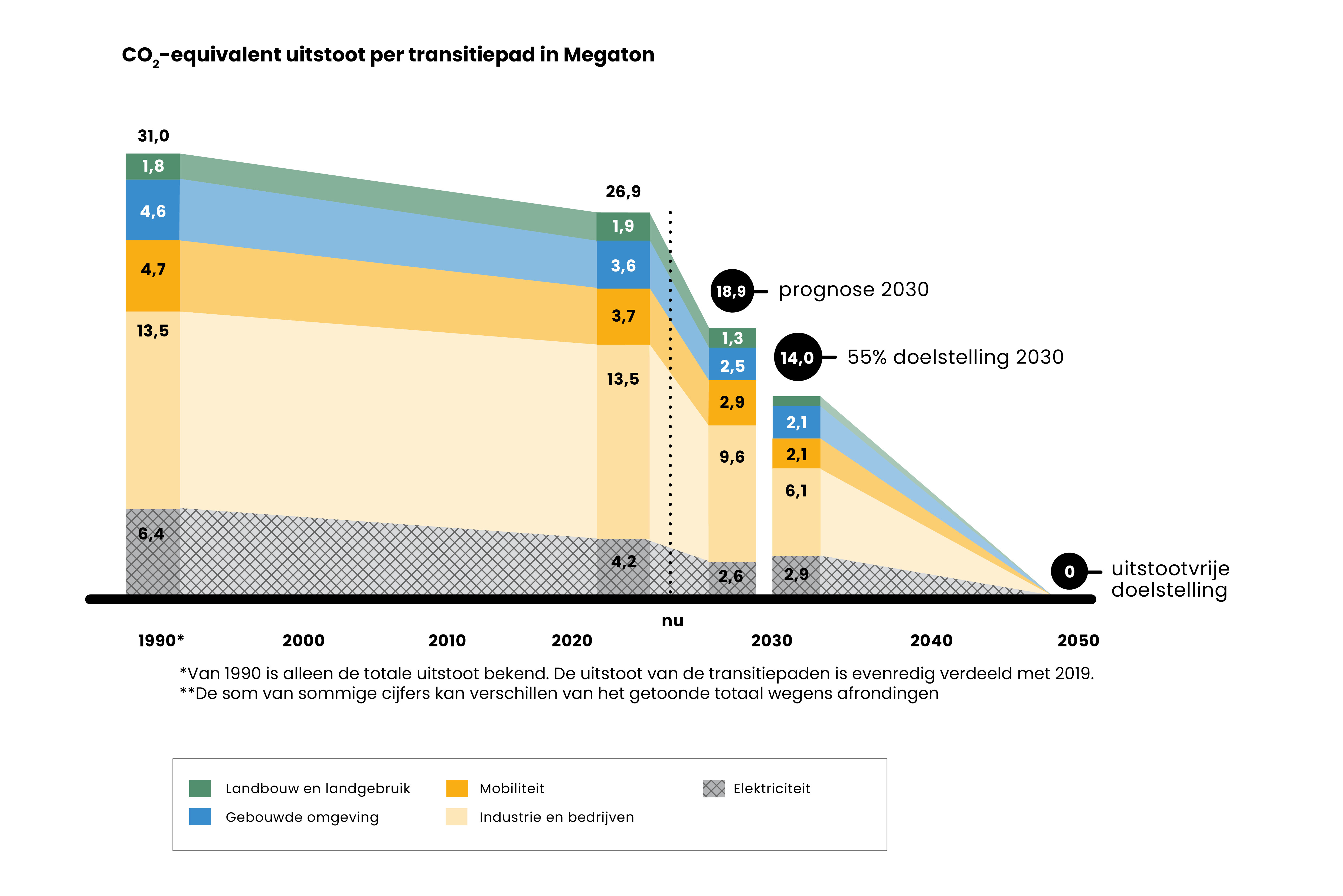 - Er is een verschil van 4,9 megaton CO₂ tussen wat we nu verwachten en wat we willen bereiken in 2030