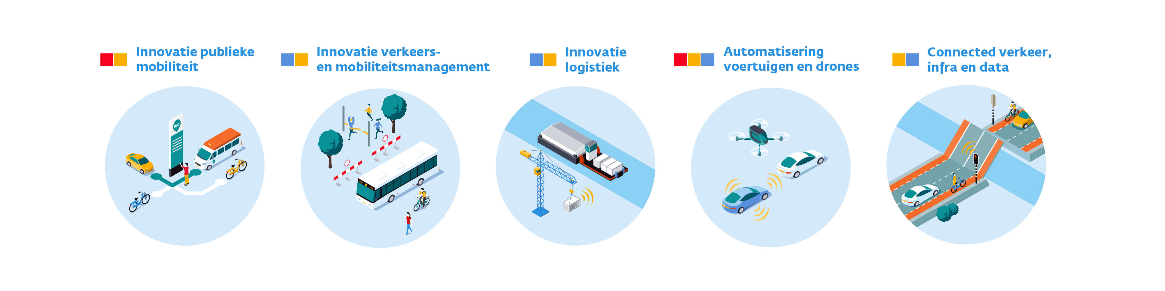 Het innovatieprogramma is onderverdeeld in 5 thema's. Deze indeling helpt om gericht te werken en keuzes te maken. De thema’s zijn gebaseerd op de ervaringen uit het vorige innovatieprogramma en onze verwachtingen voor de toekomst. Ook sluiten ze aan bij ontwikkelingen in de wereld en in de markt.
