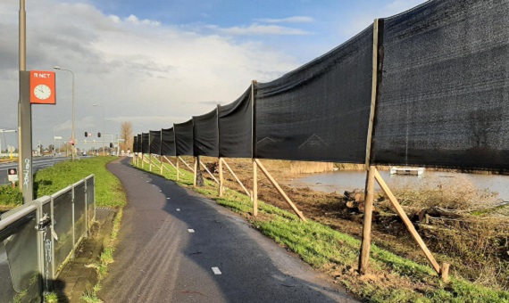 Het geplaatste vleermuisscherm - zoals op de foto hieronder - is een doek van 3 meter hoog en ongeveer 100 meter lang. Dat doek hangt tussen palen. Maar omdat het scherm op een winderige locatie staat, bleek dat niet de beste oplossing. Het scherm is bij een storm eind november kapotgewaaid. Daarom wordt nu kippengaas gebruikt. Dat laat de wind beter door en helpt de vleermuizen toch om van A naar B te komen. Bijkomend voordeel: omdat het werk bij het kruispunt overdag wordt uitgevoerd, kan het scherm overdag plaatselijk opengezet worden. Als het werk voor de dag erop zit, wordt het gaas opgehangen zodat de vleermuisroute weer werkt.