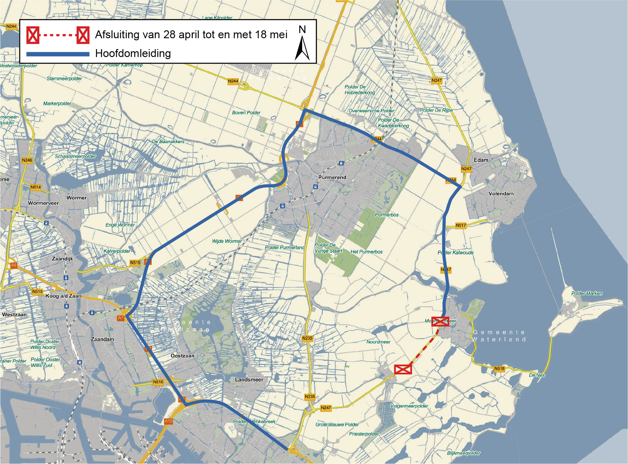 Van dinsdag 28 april 5.00 uur tot maandag 18 mei 5.00 uur is de N247 tussen Broek in Waterland en de afrit Bernhardlaan naar Monnickendam in beide richtingen volledig afgesloten voor verkeer. In opdracht van de provincie vernieuwt KWS het kruispunt en voeren zij de laatste werkzaamheden uit aan de Dijksbrug. Voor weggebruikers die normaal via de A10 de N247 oprijden en ten noorden van 1 van de afsluitingen moeten zijn, geldt een omleiding via A10 – A8 – A7 – N244 en andersom. Nood- en hulpdiensten en bussen kunnen langs het werk.