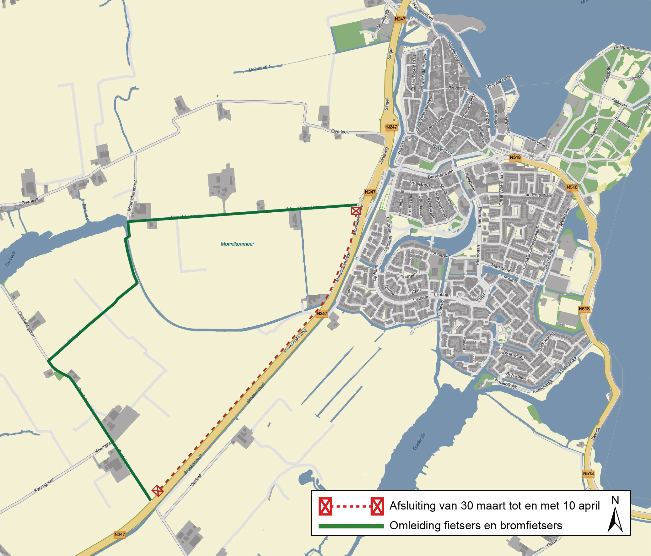 Bij Monnickendam zijn in de periode van 30 maart tot en met 18 mei meerdere afsluitingen. Een grote afsluiting van de N247 en een lokale afsluiting bij Overleek. Ook het fietspad langs de N247 is in deze periode tijdelijk afgesloten. Hieronder leest u meer informatie over de afsluitingen.